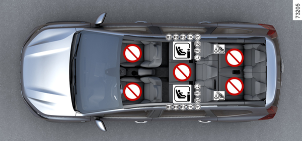 With airbag that cannot be deactivated | Without airbag or airbag deactivated | Side seats | Centre seat | |||