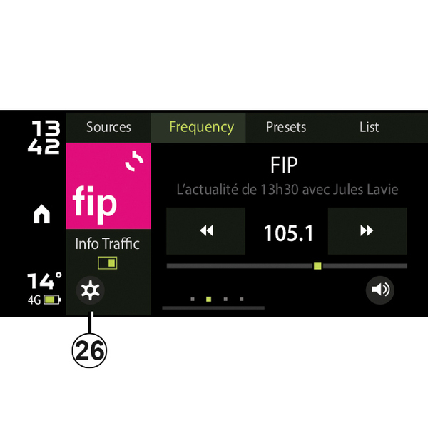 No menu de definições da aplicação " Dacia Media Control ", ao qual é possível aceder premindo o botão 26, é possível aceder às definições áudio.