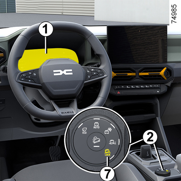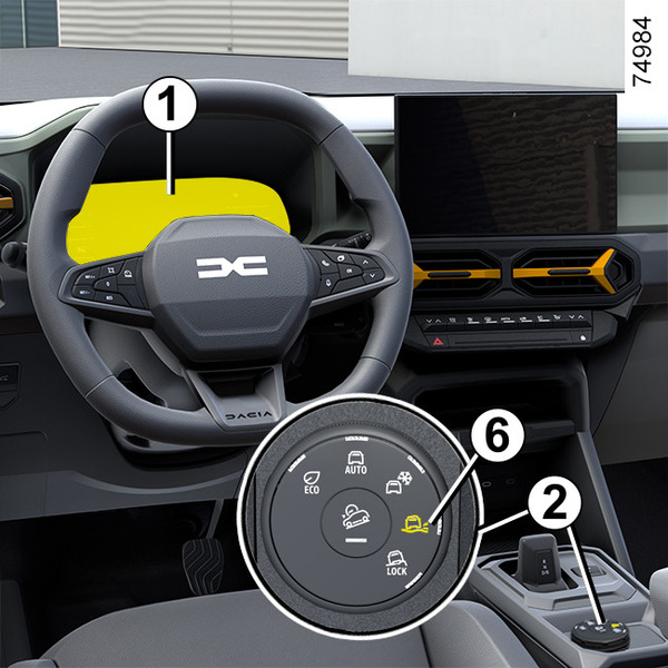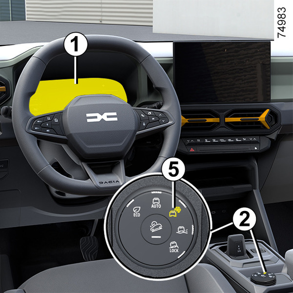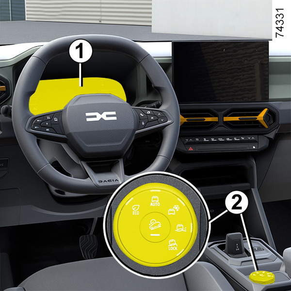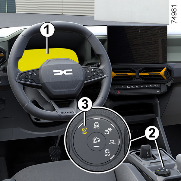 Pentru a activa acest mod, rotiţi selectorul 2 la poziţia "ECO" 3: martorul integrat în selector se aprinde, iar pe tabloul de bord 1 este afişat martorul luminos "