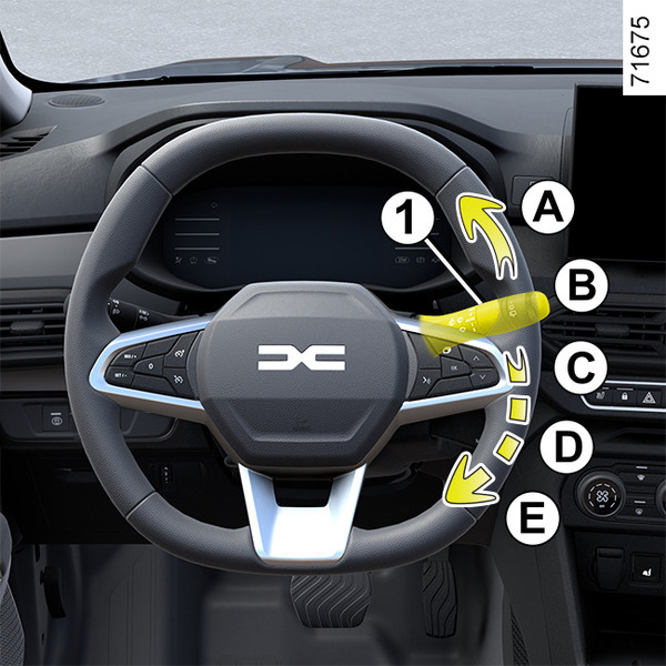 - atunci când vehiculul este spălat într-o cabină de spălare care conţine perii cu role, readuceţi maneta 1 la poziţia B pentru a dezactiva ştergerea automată.