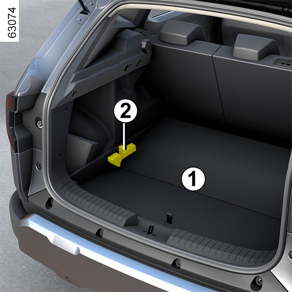 Всегда размещайте самые тяжелые предметы прямо на полу в низком положении Багажное отделение и его оснащение/ Если автомобиль оборудован, используйте точки крепления 1, расположенные на полу багажного отделения. Перевозимые вещи должны размещаться так, чтобы ни один предмет не вылетел вперед и не нанес травму пассажирам в случае резкого торможения. Пристегните ремни безопасности задних сидений, даже если там нет пассажиров.
