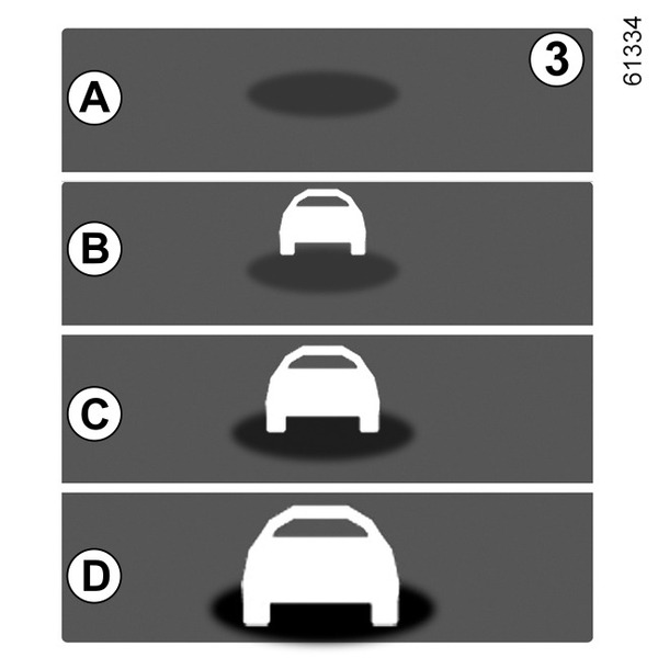 Če je časovno obdobje med voziloma krajše od približno 0,5 sekunde, bo obvestilo 3, prikazovalnik na instrumentni plošči D ostal rdeče osvetljen.
