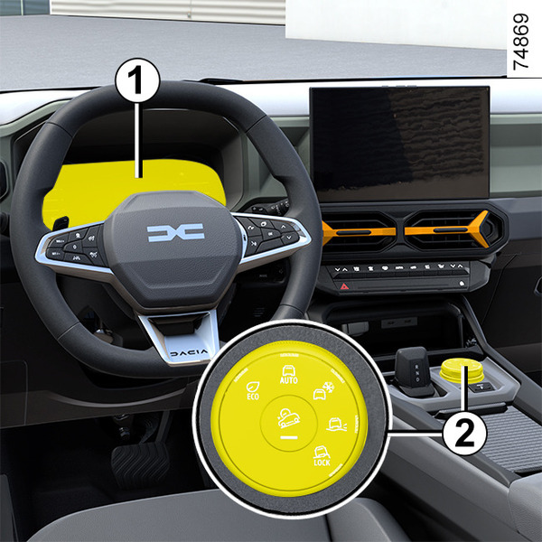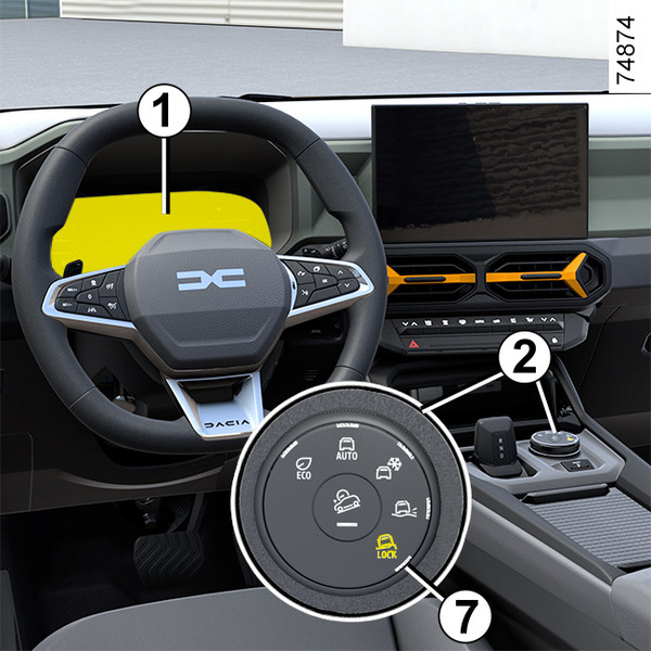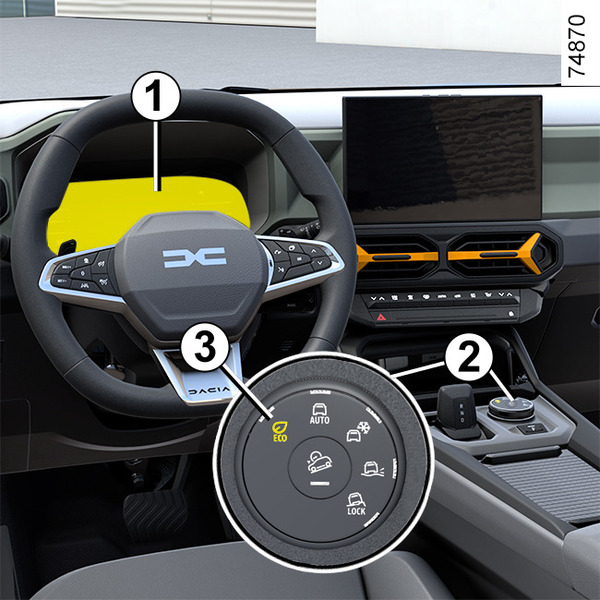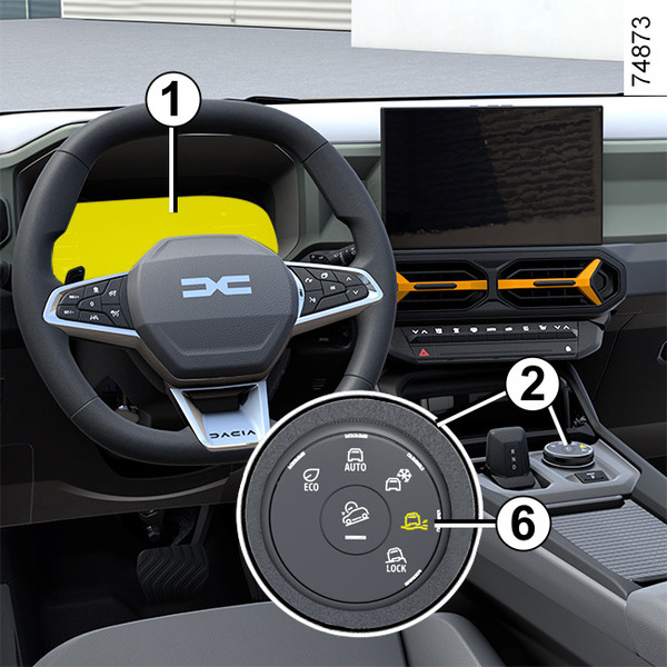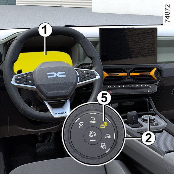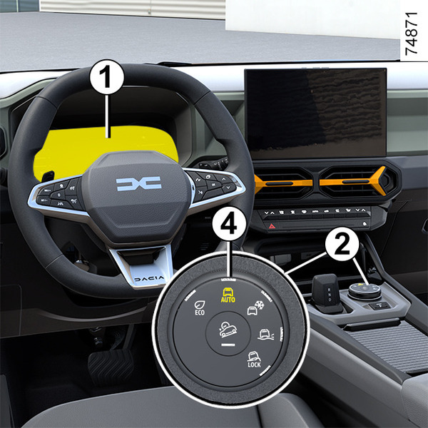 Če želite vklopiti ta način, zavrtite izbirno ročico 2 v položaj "OFF-ROAD" 7: kontrolna lučka, vgrajena v izbirno ročico, zasveti, in na instrumentni plošči se prikažeta zaslon "OFF-ROAD" in opozorilna lučka