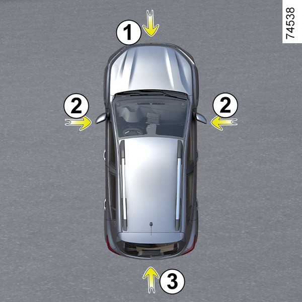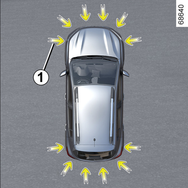 Ultrazvučni senzori, označeni strelicama 1, ugrađeni su u branike radi otkrivanja prepreka u blizini vozila.