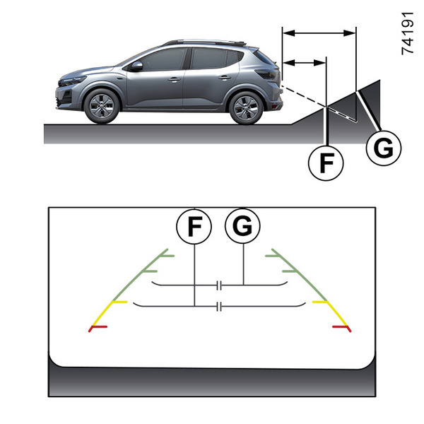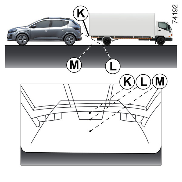 Putanja naznačena fiksnim i pokretnim linijama navođenja ne uzima u obzir visinu objekta. Dakle, postoji rizik da se vozilo može sudariti sa objektom prilikom vožnje unazad prema poziciji M.