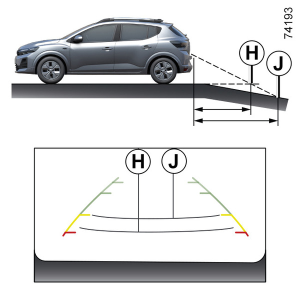 Fiksna linija navođenja se sastoji od oznaka u boji D i E koje označavaju udaljenost od prednjeg dela vozila: