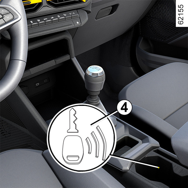 Fren veya debriyaj pedalına basınız, ardından 3 kartını 4 sembolünün üzerine yerleştiriniz. Aracı çalıştırmak için düğmeye 1 basınız. Mesaj söner.