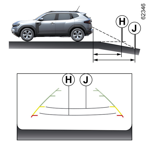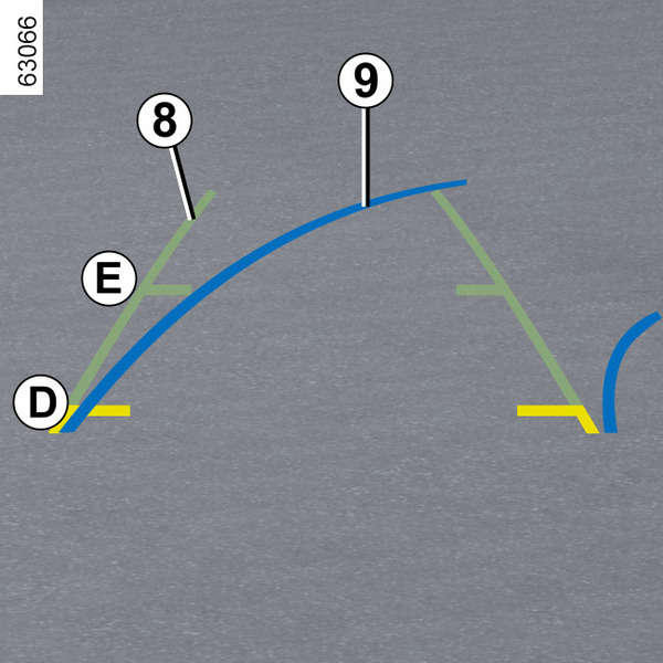 Траєкторія, вказана фіксованими й рухомими габаритами, не враховує висоту об'єкта. Тому існує ризик зіткнення автомобіля з об’єктом під час руху заднім ходом у напрямку положення M.