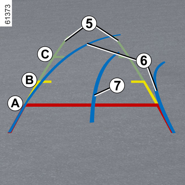 Нерухомий габарит містить кольорові маркери A, B і C, які вказують відстань позаду автомобіля:
