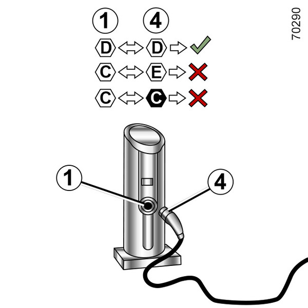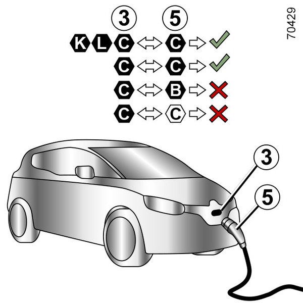 Before plugging in a charging cord, make sure that the colour and one of the letters of the inlet socket 3 correspond to the colour and one of the letters on the end 5 of the charging cord.