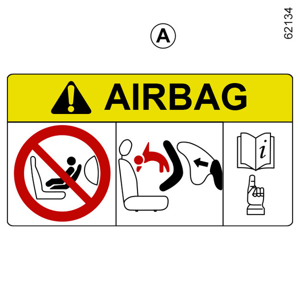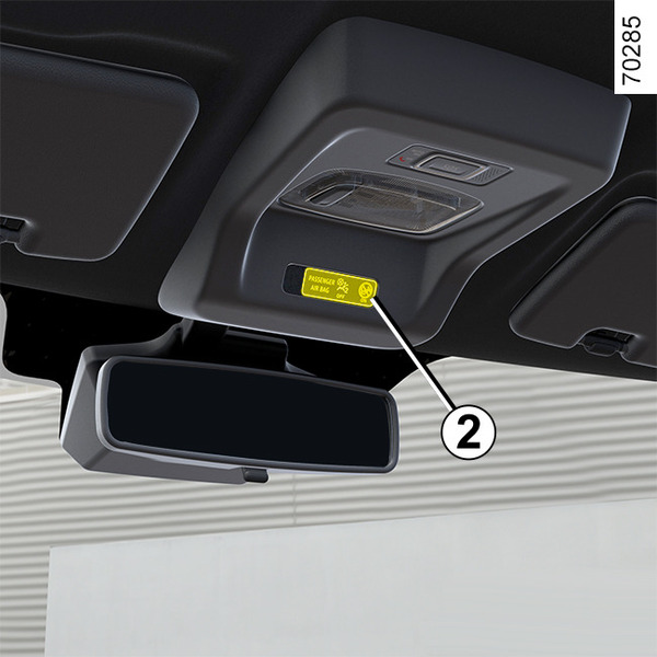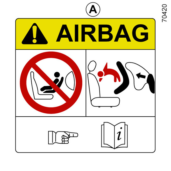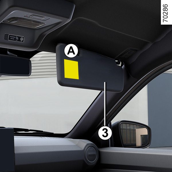 The markings on the dashboard and labels A on each side of the passenger sun visor 3 (example : label shown above) remind you of these instructions.