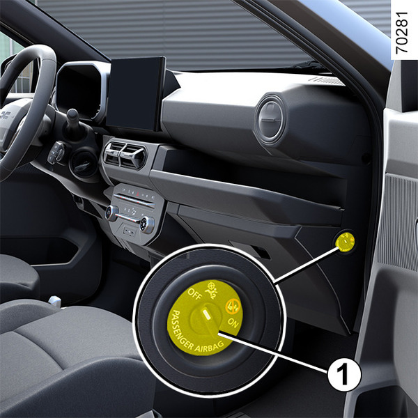In the event of a fault with the front passenger airbag activation/deactivation system, the 2_ALL_094_1_pictogramme.png and 1_ALL_036_1_pictogramme.png warning lights are displayed on the instrument panel. Switch off the ignition and check the position of the lock 1.
