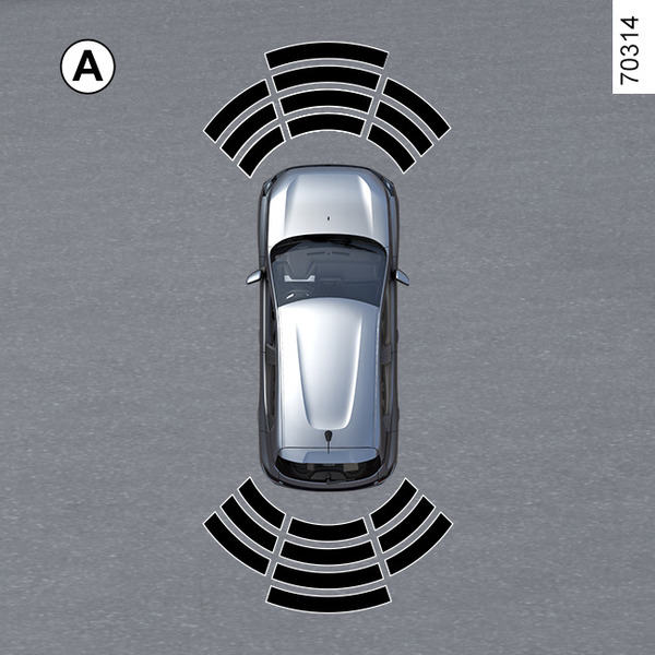 Depending on the vehicle, the area where the obstacle has been detected is shown (display A). Depending on the vehicle, the area is displayed in green, orange (or yellow depending on the vehicle) or red, depending on the proximity of the detected obstacle.